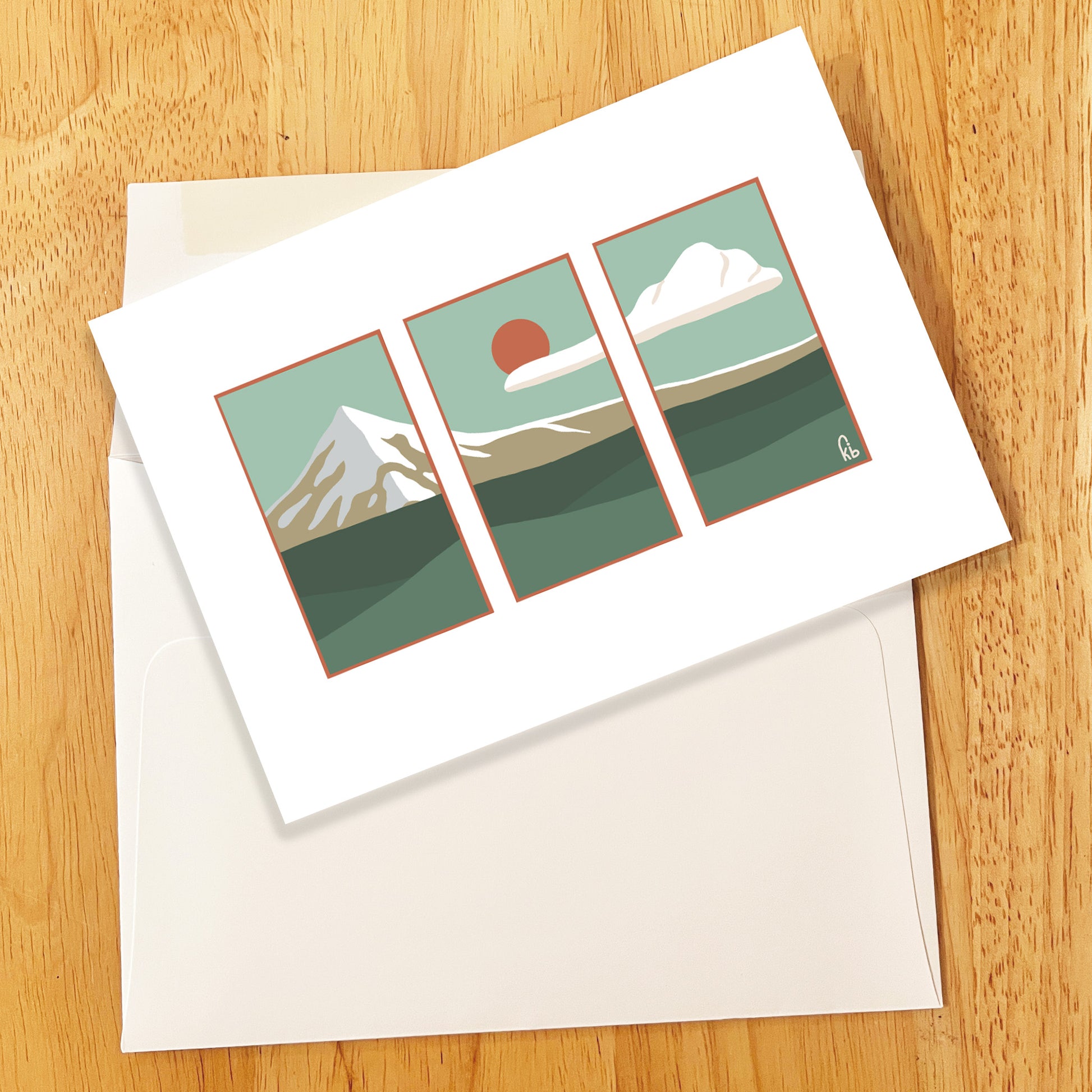 Digital illustration greeting card featuring a three pane panoramic view of Mt. Hood.